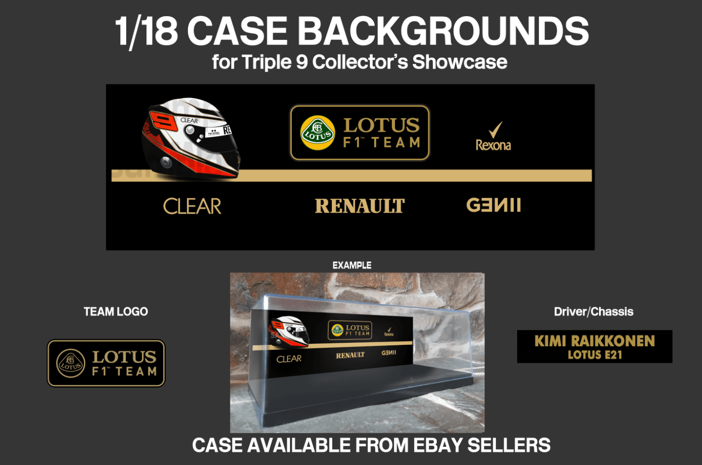 The backdrop is based on the team’s sponsors, included is the driver’s helmet, team logo and major sponsor logos. The car is for demonstration only and is not included.